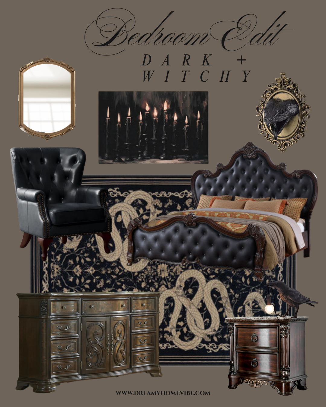 Whether you’re drawn to deep, brooding tones or whimsical, mystical details, this edit combines classic craftsmanship with a modern dark-academic flair. Ready to get inspired? Let’s dive into the pieces that make this witchy bedroom come alive.