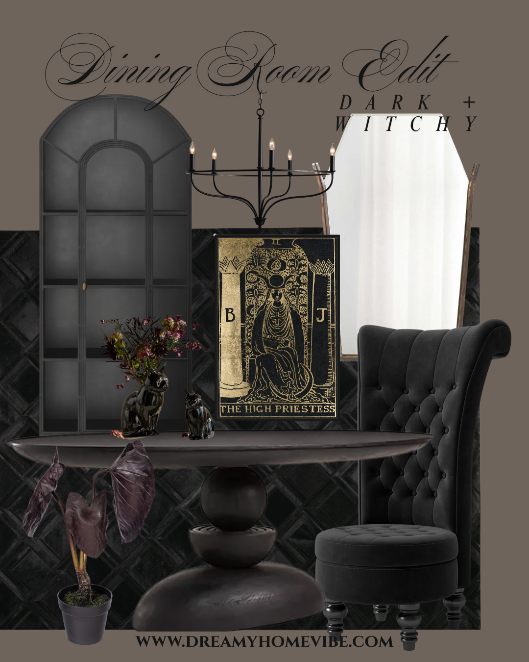This Dark + Witchy dining room blends moody elegance with sculptural texture and a hint of mysticism. Deep tones, dramatic silhouettes, and shadowy finishes create a space that feels powerful, grounded, and irresistibly atmospheric. Whether you’re hosting candlelit dinners or simply embracing your inner sorceress, this edit transforms your dining room into a modern gothic sanctuary.