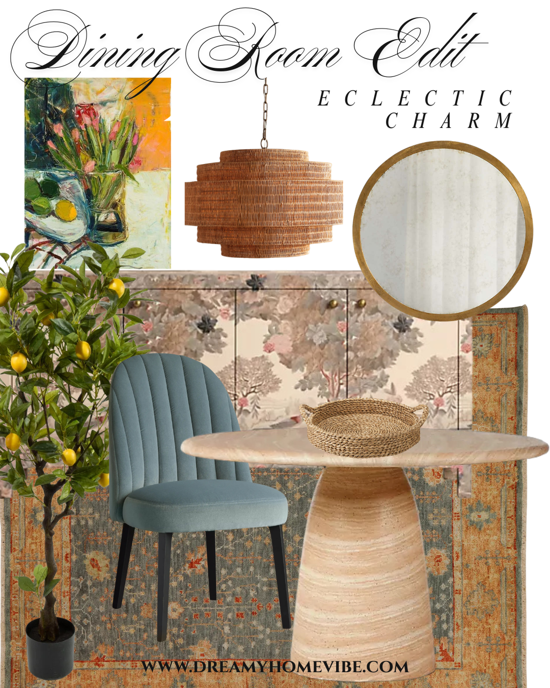 This Eclectic Charm dining room brings together texture, warmth, and playful detail to create a space that feels lived-in yet elevated. Whether you’re refreshing a single corner or creating a full dining transformation, each piece in this roundup helps build a room that feels personal, curated, and full of character.