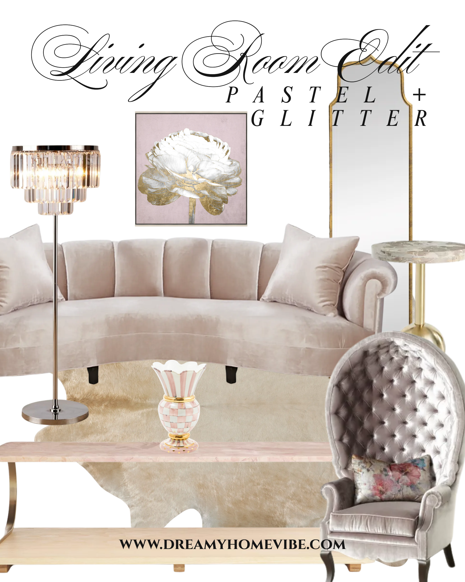 Below is the full product curation for this Pastel + Glitter living room design—each piece selected for its ability to elevate the room into a luminous, elegant escape.